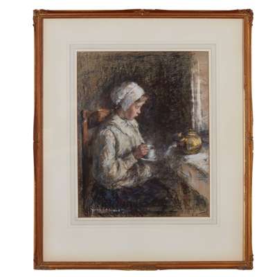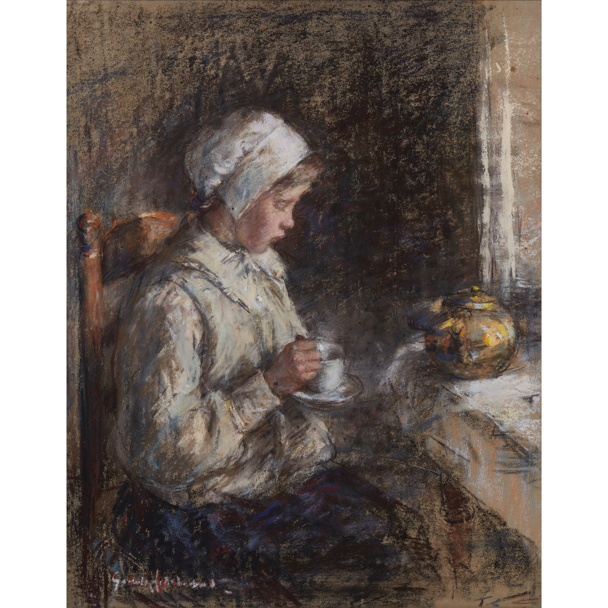 In On the Dunes, Holland and Dutch Coffee, Hutchison’s distinctive vision is applied to scenes of Dutch life. These are of particular interest given Hutchison’s enduring fascination with the Hague School. Hutchison visited Holland in 1905, and was profoundly inspired by the paintings he encountered there, which he felt captured the reality of daily rural life without idealisation or romanticisation. He was particularly struck by the work of Jozef Israëls (1824-1911), who painted scenes from the lives of fishermen, peasants or children. Upon his return to Scotland, he committed to painting en plein air with a looser, lighter, more painterly approach. He eschewed the sorrow that permeated Israëls’ painting in favour of more optimistic compositions rendered in lighter, softer tones. The selection of Hutchison paintings on offer demonstrate his innate ability to compose impressionistic strokes of colour into scenes that feel at once intimate and poignant.