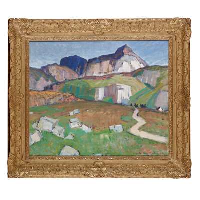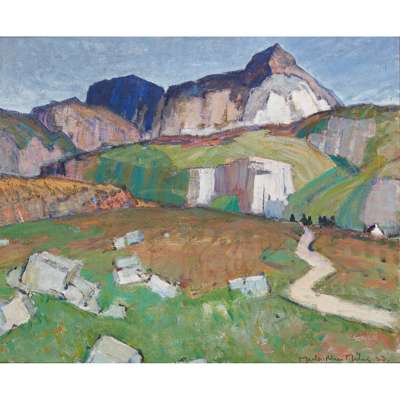 In addition to the quarry dramatically rendered in the present painting, Maclauchlan Milne was also drawn to subjects in the area including the mountains Beinn Alligin and Sgurr Ruadh. The artist's biographer, Maurice Millar, has pointed out that several Torridon works were included in Maclauchlan Milne's solo exhibition, held at Alexander Reid's gallery, La Société des Beaux Arts, in Glasgow in 1924. (ibid., p. 78).
