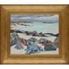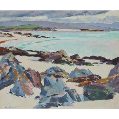 Cadell revels in the textures and weathering of the exposed and seaweed-strewn rocks in the foreground, which emerge from the pure white sand for which Iona is celebrated. The eye is led along the curve of the bay and across the sea in which Cadell captures tones of turquoise and emerald depending on the depth of the water.