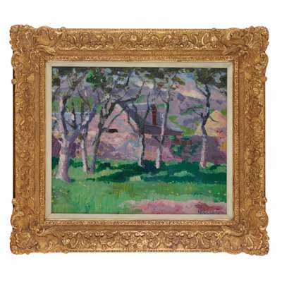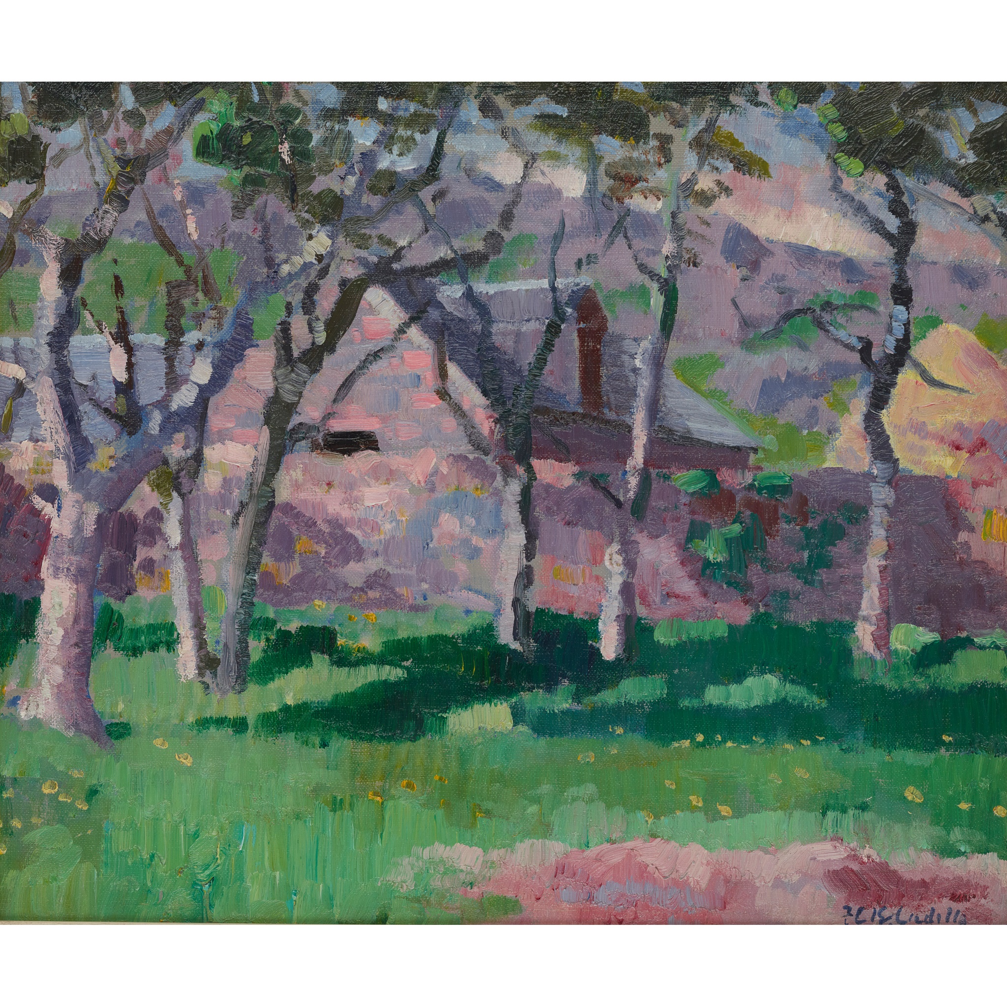 In contrast to his Edinburgh-based studio practice, Cadell also enjoyed working outdoors in locations around Scotland and France. The steading in this work is thought to be in the village of Auchnacraig on the east coast of Mull, which Cadell visited for the first time in 1927 on the way to Iona. The village and its surroundings appear in a series of at least four extant paintings (see Tom Hewlett and Duncan Macmillan, F. C. B. Cadell: The Life and Works of a Scottish Colourist 1883-1937, Lund Humphries, Farnham, 2011, p. 94). Duncan Macmillan has identified an engagement with the work of Paul Cézanne in Cadell's Auchnacraig tree landscapes, praising their 'free handling and also an interest in light that over-rides local colour' (op.cit., p. 181).