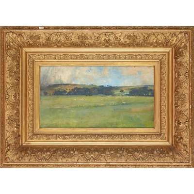Paterson once said that landscape painters should not ‘flirt with a new neighbour each remaining summer,’ and in many ways he followed his own guidance, returning repeatedly to Moniaive and its surrounding landscape. He first discovered the charming Dumfries-shire village in 1879 and moved there following his marriage in 1884. ‘Summer Pastures’ is quintessential Paterson, restrained yet decorative. He accurately captures the landscape, but the composition remains beautifully considered and balanced; elegance conveyed in the simplicity of his handling.