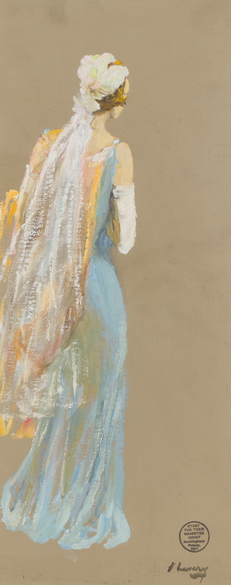 Exhibited: P. & D. Colnaghi & Co., London, Their Majesties’ Court, Buckingham Palace, 1931, Portrait Studies and Other Sketches by Sir John Lavery RA, November 1932