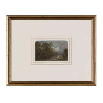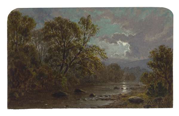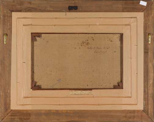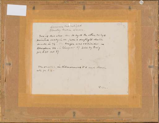 Inscription to watercolour label verso reads: 'Two of this also, one 12 by 10, the other 24 by 16, painted early in '86 from a daylight sketch made in '74. The larger was exhibited in Aberdeen '86, in Glasgow '87, sold by Doig for £40 Oct. '87. The smaller in Kilmarnock '86 and there sold for £16.'