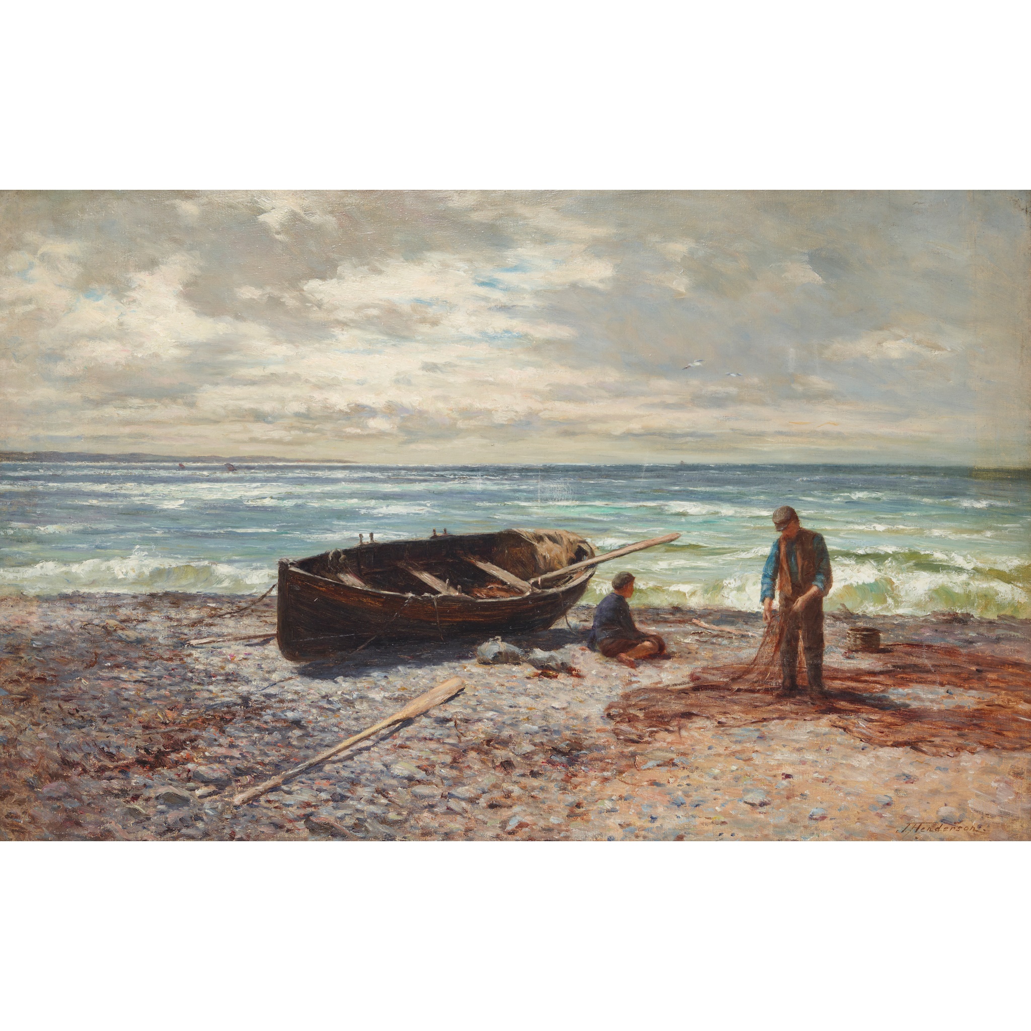 Note: While holidaying in Saltcoats around 1871, Joseph Henderson met William McTaggart, who heartily encouraged him to paint landscapes. Henderson had formerly painted figurative genre scenes, but was so inspired by the Saltcoats coast, and by McTaggart’s example, that he henceforth became a painter of seascapes. His work from this period is characterised by free brushwork and a clear, light palette. They incorporate figurative components (usually holiday-makers or fishermen), but these are treated pragmatically and integrated within the scenery so that the landscape remains of primary importance. It is perhaps for this reason that Henderson’s seascapes evade sentimentality. His ability to capture an airy coastal atmosphere, from the roiling dynamism of waves to a salty breeze, is particularly of note, as evidenced by these exceptionally fine examples.