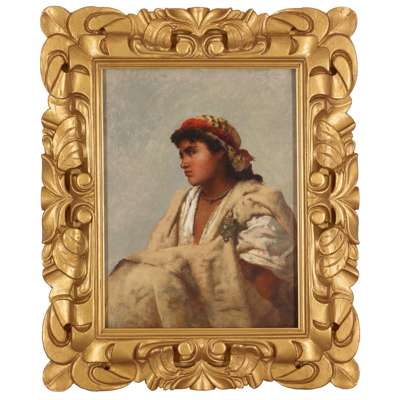 Note: By the mid-nineteenth century Robert Gavin had produced a diverse corpus of landscapes, portraits and narrative subjects based on literary themes. He was a regular exhibitor at the Royal Scottish Academy between 1848 and 1852, yet felt he had not yet found a subject that truly captured his interest. An 1868 voyage to New Orleans was to reinvigorate Gavin’s painting: he became fascinated with the city’s multiculturalism and made many portraits of black and mixed-race residents of the city. He made further excursions to north Africa in the 1870s and produced portraits and scenes of life in Tangier, where he eventually settled. In 1879 he was elected a full academician of the Royal Scottish Academy. Gavin’s expressive Odalisque is a harmony of soft colour, accented by the red dash of the subject’s headdress, which is reflected in the flush of her lips and cheeks.