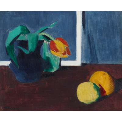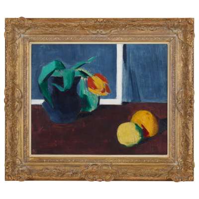 Still Life (The Tulip) is an image of extraordinary modernity; its tight handling, brilliant palette and suppression of volume embody the Art Deco style before the exhibition from which that term was derived was mounted in Paris in 1925. It may be set before a wall on the ground floor of Ainslie Place, which Cadell is known to have painted dark blue, green and brown above a light grey floor. The internal framing device around the jug is believed to be an empty white frame, of the type which Cadell often used for the presentation of his work. The cropped, asymmetric composition sets up a striking relationship between tulip head and fruit, whose brilliant colour stands out against the dark background and tabletop.