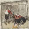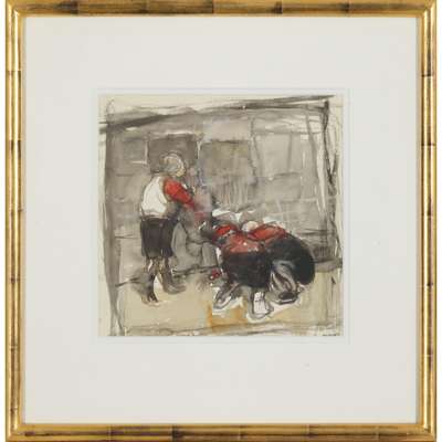 Two Children (Lot 169) is a particularly resolved and successful work. Skilful layering and blending of multi-coloured pastels focus attention on the children’s faces, their overlapping pose suggesting the intimacy of siblings. Eardley’s gestural technique communicates the patterning of their clothing, which gives way to free form mark-making.