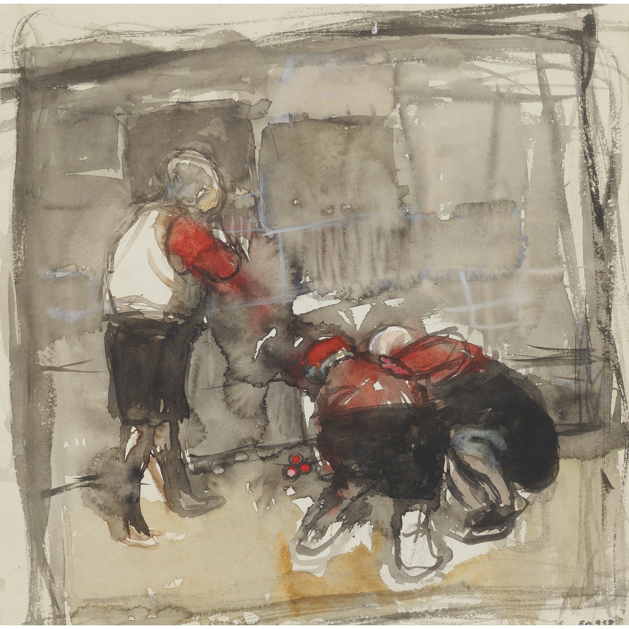 Eardley became a familiar figure sketching and photographing in the streets, drawn to the games and squabbles of the neighbourhood’s children and to evidence of lives lived in and amongst its decaying architecture. She worked spontaneously, at speed and often on the modest scale afforded by pocket sketchbooks, using larger sheets, chalks and pastels when developing imagery on return to her studio.