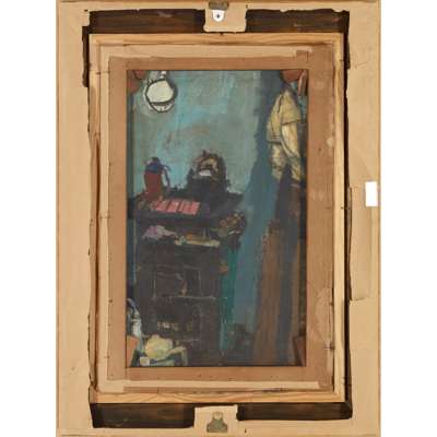 The low vantage point means the cottage nestles above swathes of snow and beneath a sky in which dawn is advancing. Touches of colour bring out features such as the window frames and areas of weathering on the gable end. The interior painted on the work’s reverse provides a glimpse into its interior, showing the artist’s kettle set upon a gas stove. On receiving the painting, Mrs McLusky pointed out that it was unsigned, whereupon Eardley wrote her name in pencil at the lower right.