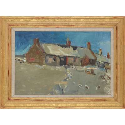 Eardley gave Footsteps in the Snow, The Row, Catterline (Lot 168) to her mother’s housekeeper, Mrs McLusky in 1963. Mrs McLusky later explained that it had been made at daybreak after a fresh fall of snow. The footprints are those of the artist leaving No.1 South Row and finding the place from which to paint the scene. The cottage was the last in a row of ten and has been described thus: