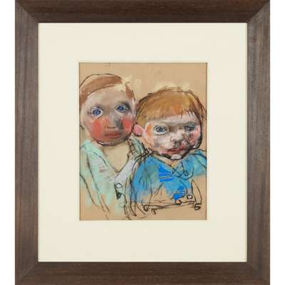Two Children (Lot 169) is a particularly resolved and successful work. Skilful layering and blending of multi-coloured pastels focus attention on the children’s faces, their overlapping pose suggesting the intimacy of siblings. Eardley’s gestural technique communicates the patterning of their clothing, which gives way to free form mark-making.