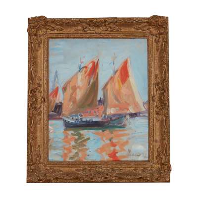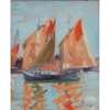 Working at speed and with fluency, Cadell applied thick brushstrokes to his support, with the zig-zagged reflections a passage of particular verve. Terracotta dominates his palette, with areas painted ‘wet on wet’ used as a method by which to quickly combine tones in a lively expression of form, such as the billowing of the sail fabric and the prows of the boats.