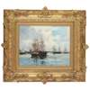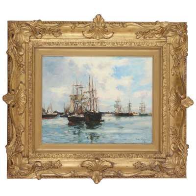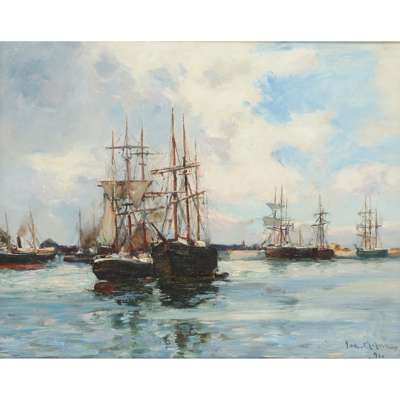 Sailing ships and fishing boats in harbours were recurring themes throughout Joseph Milne’s career as a landscape artist from 1880 to 1911, particularly in the early 1890s. His maritime paintings depicted locations ranging from the River Thames and the River Tyne to Tayport, Perth and Leith; to Tarbert, Loch Fyne and the River Clyde on the west coast; and barges at Dordrecht in the 1880s. Many of his shipping pictures now have generic titles, with no particular location specified. When he painted this picture in 1891, he also produced another of sailing ships in Tayport Harbour.