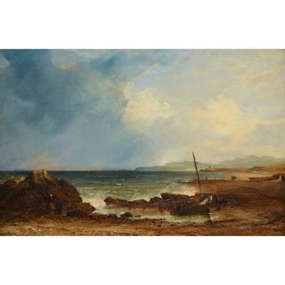 A COASTAL SCENE WITH BEACHED FISHING BOATS