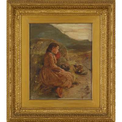 Weary by the Wayside is a relatively early work dating to the period directly after McTaggart’s graduation from the Trustees Academy amongst an inordinately talented cohort including William Quiller Orchardson, John Pettie, Hugh Cameron, Peter Graham, John MacWhirter and Alexander Burr. Many of these artists moved to London, but McTaggart remained in Edinburgh, taking a studio in Charlotte Square. The more traditional subject-matter of a girl and her attendant terrier belie the picture’s technical ingenuity; the paint has been applied in highly energetic flicks, in which we can detect the genesis of McTaggart’s ‘broken colour’ technique synonymous with his later work.