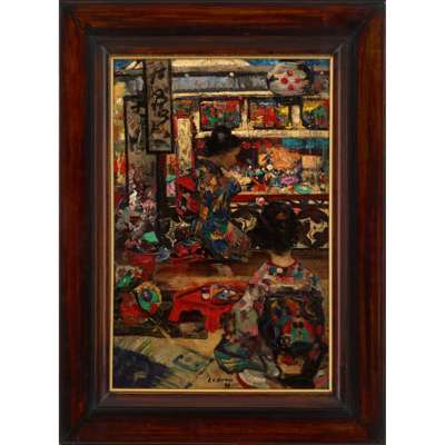 Hornel delighted in direct contact with Japanese culture and the trip proved to be a turning-point in his oeuvre. As can be seen in A Japanese Tea Garden, he revelled in the customs, clothing and decorative schemes that he witnessed. Richly evocative paintings, teeming with luminous colour and beguiling detail were realised in thickly applied oil paint, and met a triumphant reception when exhibited at Reid’s gallery La Société des Beaux-Arts in 1895. All but one of the forty-four works sold. The critic of the Glasgow Evening News exclaimed:
