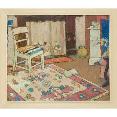 Interior with Patterned Rug dates from this propitious period in Redpath’s career. She continued the tradition of the interior in Scottish art history, following in the footsteps of forebears including David Wilkie, Wiliam Quiller Orchardson and more recently F. C. B. Cadell, and made a distinct contribution to the genre in her own right. Having been struck by the effect of a colourful rug hung on white plaster walls in Florence whilst on an Edinburgh College of Art travelling scholarship, Redpath thereafter took great care over the decoration and furnishing of her homes. They in turn became the subject of some of her most celebrated works, not least The Mantelpiece of c.1947 in the collection of the National Galleries of Scotland.