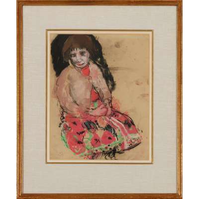 Not least due to her young subjects’ energy, Eardley worked at speed, often using pastel to introduce areas of rich colour and sometimes, as in The Patterned Skirt, on sandpaper, whose abrasiveness adds a tactility and sense of material realism. The girl’s thoughtful gaze at first the artist and now the viewer is compounded by the neat holding of her hands in her lap. A varied, gestural use of pastel captures the vivid patterning and palette of the titular garment, conveying a sense of the immediacy of and moment of execution.
