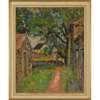Path through the Village, Fife is a more expansive view in which picturesque low-rise stone buildings frame a view along a footpath. There is a sense of unseen people living in harmony with nature, under the shade provided by ancient trees and with hints of space and light beyond. Hunter’s palette, based on shades of green and brown, speaks of the fecundity of the area and a benign climate.