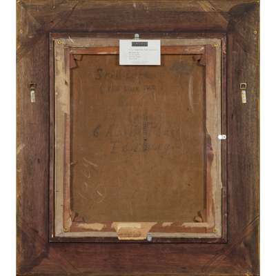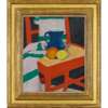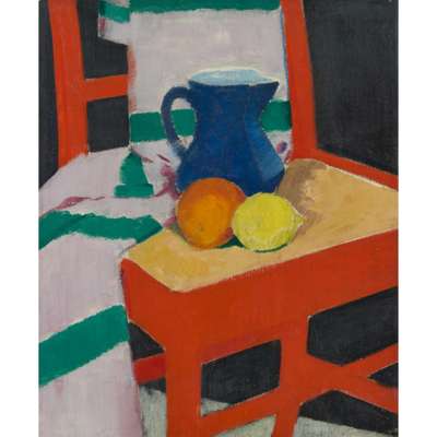The seat of the chair is used as a novel alternative to a tabletop on which to assemble some of the artist’s most effective still-life objects; the lilac and green fabric, draped over the chair’s back and seat, draws the viewer’s eye from upper centre to lower left of the image, whilst the trio of blue jug, orange and lemon forms a brilliantly coloured focal point. Depth, height and the space beyond the canvas are all realised or hinted at with great skill.
