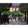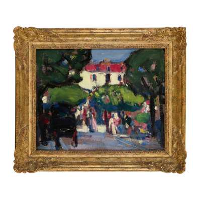 This painting comes from a series of vibrant street scenes in which Fergusson’s excitement about his new surroundings and the impact of contemporary avant-garde French painting is clear. He revelled in the depiction of the city’s architecture and citizens going about daily life, whilst his brushwork became bolder, his forms became simpler and his palette became brighter. Here, robustly realised trees in shadow give way to brightly lit bustling activity and on to a high façade, which itself gives way to a dazzling sky.