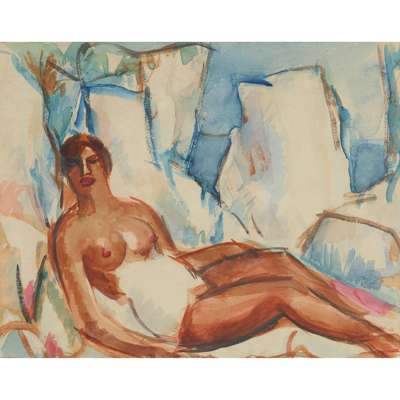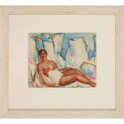 Morris visited Fergusson in this idyllic setting during the summer of 1914, but her stay was cut short by the outbreak of World War One. From 1917, she developed her renowned Summer Schools, which were held in Antibes on multiple occasions from 1923. As can be seen in the works presented here, ‘she and her pupils dancing outdoors, sunbathing and swimming in the sea inspired Fergusson to make numerous sketches and watercolours, which he later worked up into paintings in his studio, exemplifying the couple’s creative collaboration.’ (Alice Strang et al, J. D. Fergusson, National Galleries of Scotland, Edinburgh, 2013, p.22).