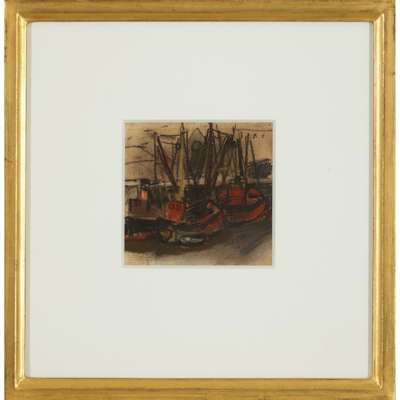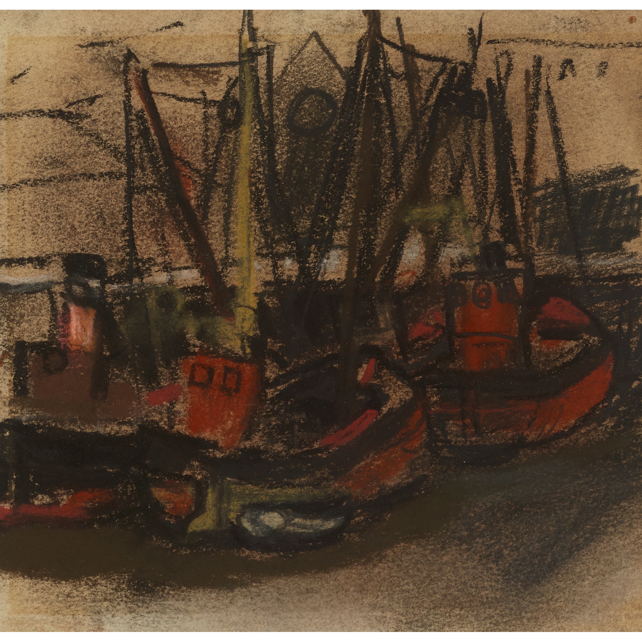 Eardley immersed herself into the community and its way of life. The activities of its working harbour provided rich subject matter, as seen in Salmon Fishing Nets – Study. As Patrick Elliott has explained: ‘…the salmon-fishing season on Scotland’s east coast lasted from 16 February until 31 August…in order to conserve stocks, the fishermen were required by law to remove the long nets by noon on the Saturday and were not permitted to replace them before 6am on the following Monday. The long nets were cleaned and dried on the stony beach on the Saturday afternoon….the nets were hung up on the Makin Green, a rough grassy patch near the salmon bothy, on giant larch poles five or six metres tall.’ (Patrick Elliott, Joan Eardley: Land & Sea – A Life in Catterline, National Galleries of Scotland, Edinburgh, 2021, pp.107 & 111). Executed in pastel, Eardley joined three sheets of support in order to complete the current composition.
