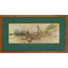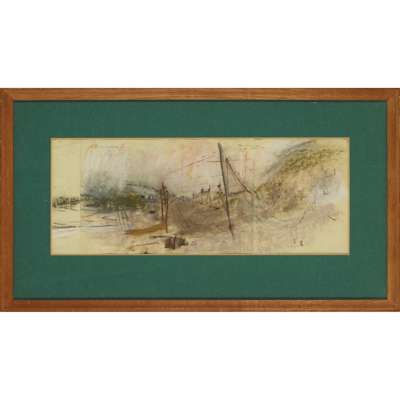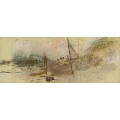 Eardley immersed herself into the community and its way of life. The activities of its working harbour provided rich subject matter, as seen in Salmon Fishing Nets – Study. As Patrick Elliott has explained: ‘…the salmon-fishing season on Scotland’s east coast lasted from 16 February until 31 August…in order to conserve stocks, the fishermen were required by law to remove the long nets by noon on the Saturday and were not permitted to replace them before 6am on the following Monday. The long nets were cleaned and dried on the stony beach on the Saturday afternoon….the nets were hung up on the Makin Green, a rough grassy patch near the salmon bothy, on giant larch poles five or six metres tall.’ (Patrick Elliott, Joan Eardley: Land & Sea – A Life in Catterline, National Galleries of Scotland, Edinburgh, 2021, pp.107 & 111). Executed in pastel, Eardley joined three sheets of support in order to complete the current composition.