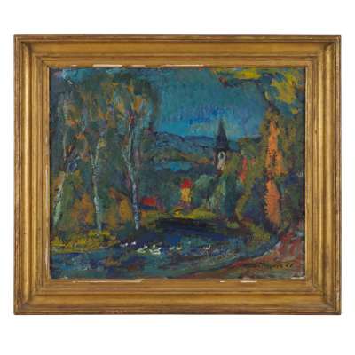 A WOODED LAKE WITH DISTANT CHURCH SPIRE