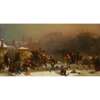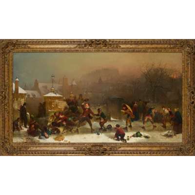 Street Scene on a Winter Day - A Slide is expansive in its scope, allowing Ritchie to comprehensively illustrate the hijinks of a group of boys who have come across an ice slide on the streets of Edinburgh. Ritchie revels in the spectrum of emotion from the determined expressions of those sliding in from the right-hand side, to the shock of the boys in the centre who spot the impending pile-up, culminating in the gleeful tumble of limbs on the left as the children fall to the ground. It is just as well that the boy crouching in the very centre of the composition wears a scarf tied around his ears, which protects his head from the chill of the snowball that has just found its target. Outraged, he wheels round to identify his assailant, who has wisely positioned himself to the lower centre: he is already poised, on all fours, with a further snowball. One adventurous soul wears a wicker trug as a protective shield on his back, the vegetables it previously carried abandoned on the snow. Evidence of further summarily forgotten errands can be found in the letter-bundle and loaves of bread flying through the air, and the upturned basket of onions. A pamphlet affixed to the far-left wall reminds the viewer of the ongoing Crimean War, which had raged since October 1853, but Ritchie’s painting celebrates the suspension of worldly duties and cares for the simple pleasure of playing in the snow - even if only for a few moments. It is evident that the ice slide has proven a delightfully irresistible prospect for these boys.