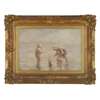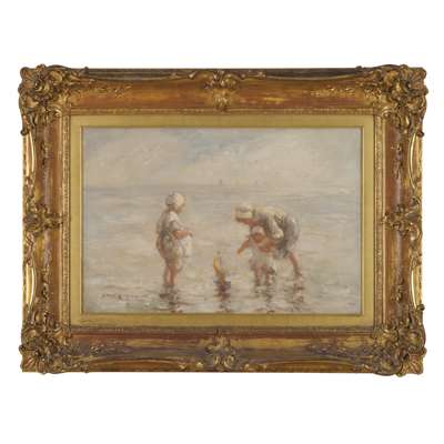 In 1905 Gemmell Hutchison travelled to Holland to view paintings of the Hague School, and was particularly struck by Jozef Israëls’ (1824-1911) depictions of the daily routines of fishermen, peasants and children. Upon his return to Scotland, he resolved to paint en plein air with a looser, lighter, more painterly approach. He eschewed the tragedy that permeated Israëls’ work in favour of gentleness and innocence. Gemmell Hutchison came to specialise in sympathetic depictions of children playing on beaches, and the Dutch caps they often wear have come to be seen as one of the artist’s signature motifs.