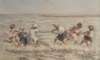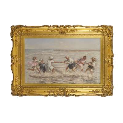 In 1905 Gemmell Hutchison travelled to Holland to view paintings of the Hague School, and was particularly struck by Jozef Israëls’ (1824-1911) depictions of the daily routines of fishermen, peasants and children. Upon his return to Scotland, he resolved to paint en plein air with a looser, lighter, more painterly approach. He eschewed the tragedy that permeated Israëls’ work in favour of gentleness and innocence. Gemmell Hutchison came to specialise in sympathetic depictions of children playing on beaches, and the Dutch caps they often wear have come to be seen as one of the artist’s signature motifs.