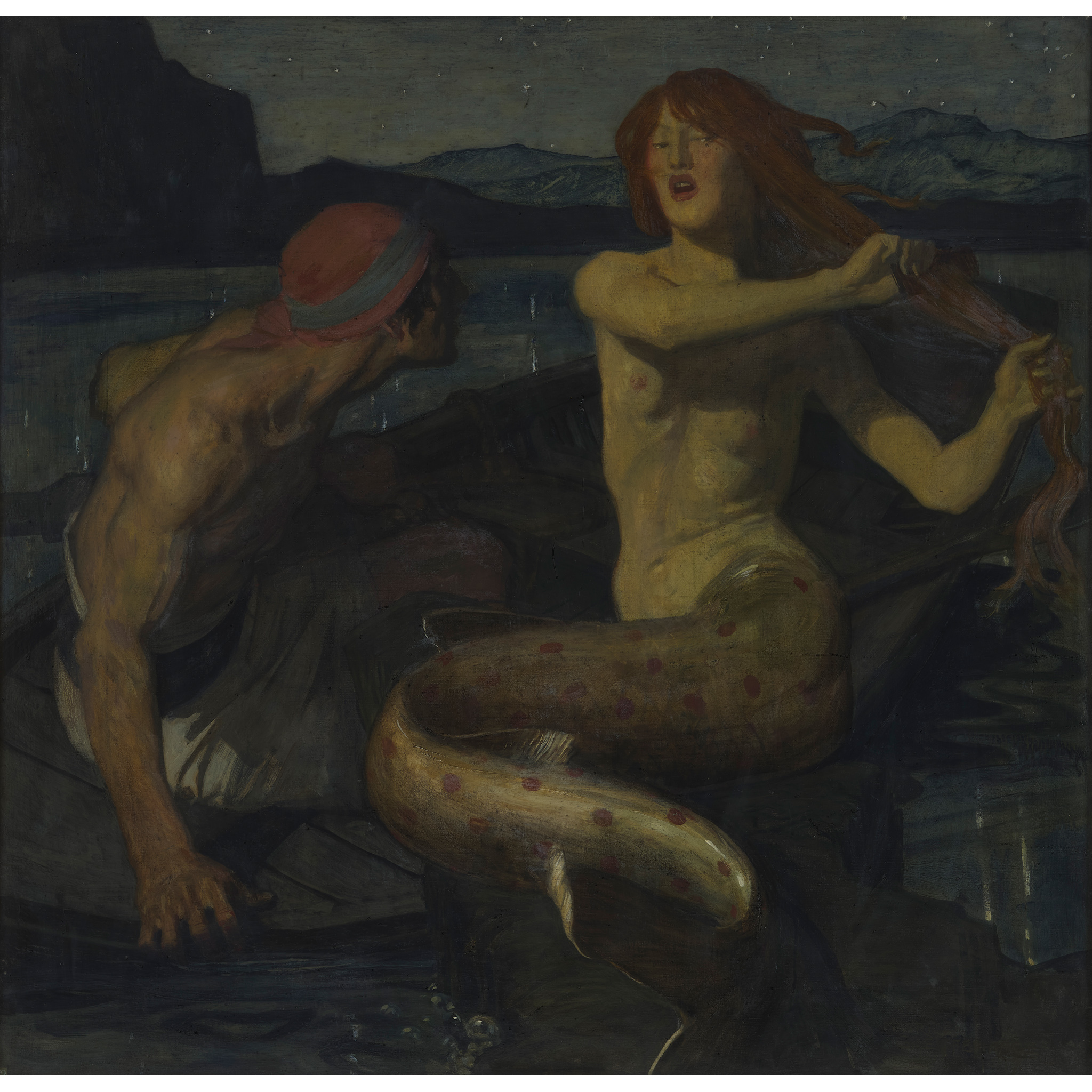 Maurice Greiffenhagen had a strong sense of design. He worked extensively on book illustrations and commercial posters, as well as painting, throughout his career. From 1906 until1926 he taught at Glasgow School of Art as Professor of the Life Classes, though he attended the school as little as was feasible to allow the maintenance of his own art practice in London. The students were left day-to-day in the capable hands of his assistant professors, including fellow artist David Forrester Wilson (see lot 154). Greiffenhagen uses The Mermaid as an opportunity to display his talent for both compelling design and proficient life drawing, alongside his enjoyment of rich colour and ability to create a unified decorative scheme, with the background rich and shimmering around the central drama.