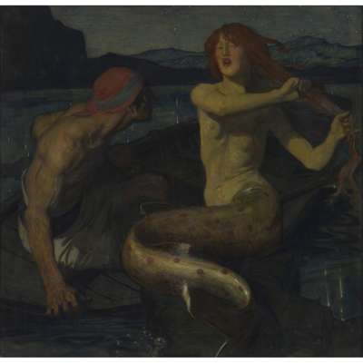 Mermaids have appeared in folklore across the world for centuries. The mystery of the ocean with its great depths and unsettling turbulence inevitably gives rise to speculation as to what may lie beneath. With the head and torso of a woman and the lower body of a fish, these compelling creatures have unpredictable narratives, being viewed as both symbols of good luck and safety for sailors and as an indication of impending danger. These meanings have enmeshed with the lore around sirens, the beautiful and cruel female creatures of the sea who use their song to lure men to their deaths. Mermaids are also imbued with a sense of longing: they yearn for a life on land which they can’t physically survive, while humans, in turn, covet the mermaid exoticism and beauty; it is an eternally doomed relationship. This atmosphere of longing is what Greiffenhagen so dramatically captures here. The sinuous bodies of both figures are captured in a dynamic tension with each other, with the mermaid’s auburn hair and glistening tail filling the right-hand side of the composition and compelling the sailor towards her. The aquatic background throws their pale skin and her glittering scales into sharp relief, its sumptuous dark blues enriching the scene as the shimmering reflections are picked up in dotted highlights. The mermaid is depicted combing out her long lustrous hair, a common symbol associated with both vanity and the sea that highlights her beauty and allure.