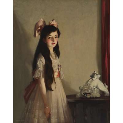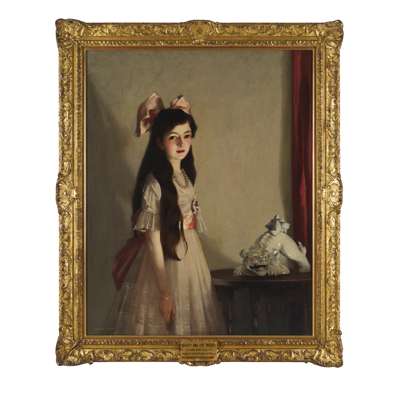 Portraiture at the time contained subsets of trends, led in the main by the two greatest figures of influence, Whistler and Sargent. The Glasgow Boys were famously devotees of the Whistlerian aesthetic, and this is most clearly borne out in Beauty and the Beast. This is manifest in the drama of simple shapes against a minimalistic background, the balanced pre-occupations of aestheticism with factual likeness, and above all, the restrained palette of harmonious tones. It is an unusually arresting portrait of a young girl on the cusp of womanhood, in which the artist is playfully overt about the subtext connoted by the painting’s title. The strong, glancing light is nothing short of dramatic, and in impactful contrast with the childlike ‘prettiness’ of the pink bows and white lace of her hair ribbon and dress. The shadows which portentously loom behind the sitter serve to enhance the allegory at the portrait’s heart. Her expression is hard to place – simultaneously direct and reticent, the overall effect being subtly enigmatic.