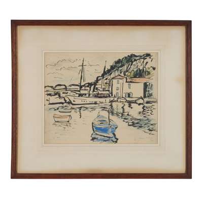 Favoured working locations also included Antibes, Saint Tropez and Cassis and works such as Harbour, South of France, Street in Antibes and Houses on a Hillside, South of France, show how much Hunter enjoyed the climate, architecture and natural beauty of the region. All executed in pen, ink and coloured chalks, they reveal Hunter’s deftness of touch, whether depicting a boat, building, tree or hillside. Compositional devices such as a brightly-coloured boat in the foreground, or a verdant tree stretching up the left-hand side are combined with red roofs, green shutters and yellow-painted houses to create idyllic, sunkissed scenes.