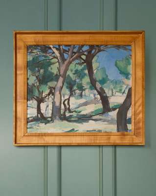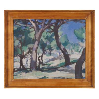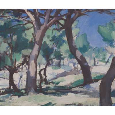 Peploe enjoyed a practice based on working en plein air as well as in a studio. Trees, forests and woods are a mainstay subject of the former strand in his oeuvre and he was drawn to them in locations as varied as Antibes, Cassis, Kirkcudbrightshire and the Scottish Highlands; the windy weather on his beloved Iona prevents the growth of trees on the island. The expressive potential of trees, their trunks, branches and leaves, whether singular or growing in groups, provided Peploe with an endless variety of form and character with which to connect with nature and to establish a sense of place.