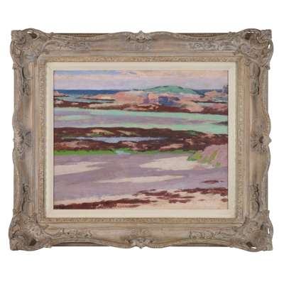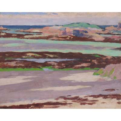 In contrast to Peploe’s preference for the North End of the island, Cadell painted across Iona, from coastal views on the east and west, to the village and the Cathedral, to haystacks and croft buildings. The present painting depicts The Machair Bay on the west coast of Iona, which is also known as the ‘Bay at the Back of the Ocean’. As Philip MacLeod Coupe has identified, the vertical rock step at the right-hand edge of the painting is the end of Eilean Didil (see Philip MacLeod Coupe, Paintings of Iona by F. C. B. Cadell and S. J. Peploe, privately published, 2014, p.201).