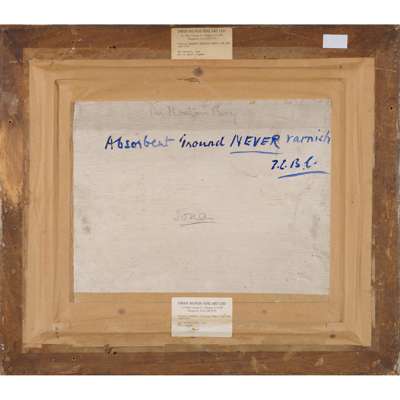 This work is a classic example of Cadell’s depiction of the pristine white sand, luminous blues of the sea, fertile vegetation and varied geology of Iona, all captured under the gentle Hebridean light of the area. The eye is led from the sandy foreshore rising through the composition to the high horizon line and sun-kissed sky. Cadell enjoyed working en plein air and The Machair Bay is painted on a standard sized and easy to transport board measuring 15 x 18”, on a white gesso ground. This absorbs paint allowing the artist to work quickly, an advantage when weather conditions could vary from one moment to another and necessitating the legend inscribed by Cadell in his favourite colour of blue paint on its reverse: ‘Absorbent Ground NEVER varnish’.