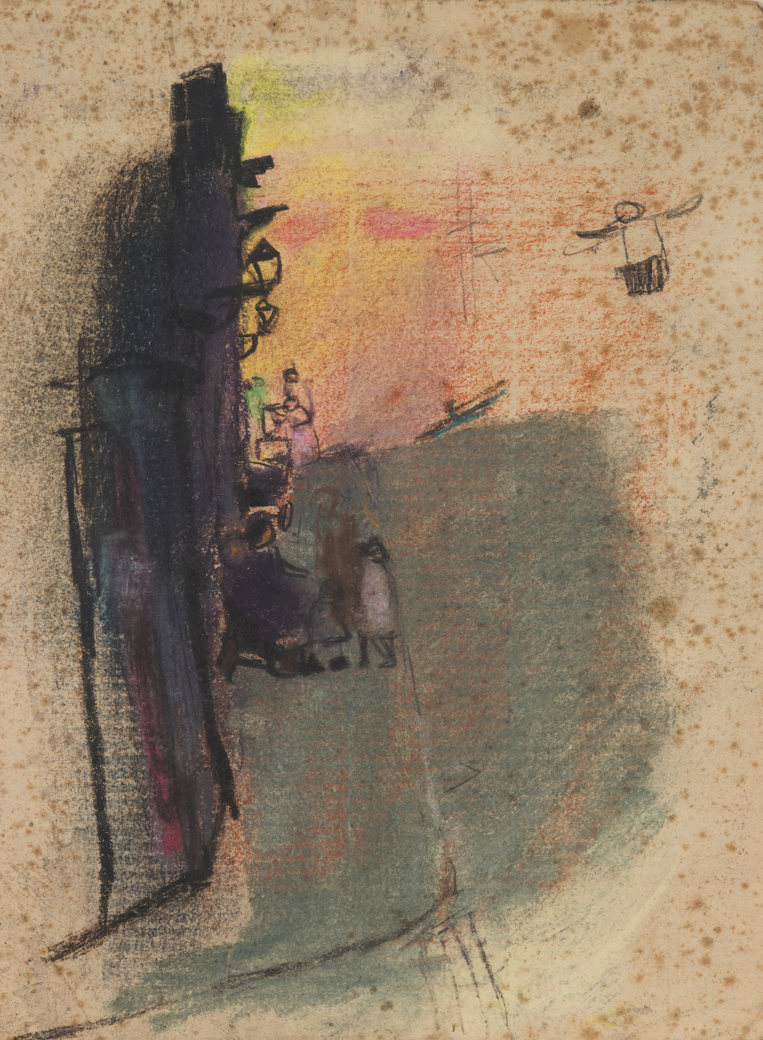Neil was known to have struggled greatly after the loss of his stalwart friend Eardley to cancer, even being sectioned at one point in Montrose Psychiatric Hospital. He was dependent for a time on the charity and care of members of his circle, notably the artist Carole Gibbons, as well as the local medical community. Lyon & Turnbull are delighted to present to market select works from one of Eardley’s sketchbooks, gifted by Neil to a caring local doctor in Glasgow in the 1960s who gave him room and board during a breakdown. The sketchbook has been much treasured by descendants within the doctor’s family. It gives a wonderful insight into Eardley’s oeuvre, containing representations of virtually every subject one might associate with her: from studies of children to cityscapes and shorelines; all excellent examples of her astute observational skills and intuitive mark-making ability, as well as her astounding consistency of quality.