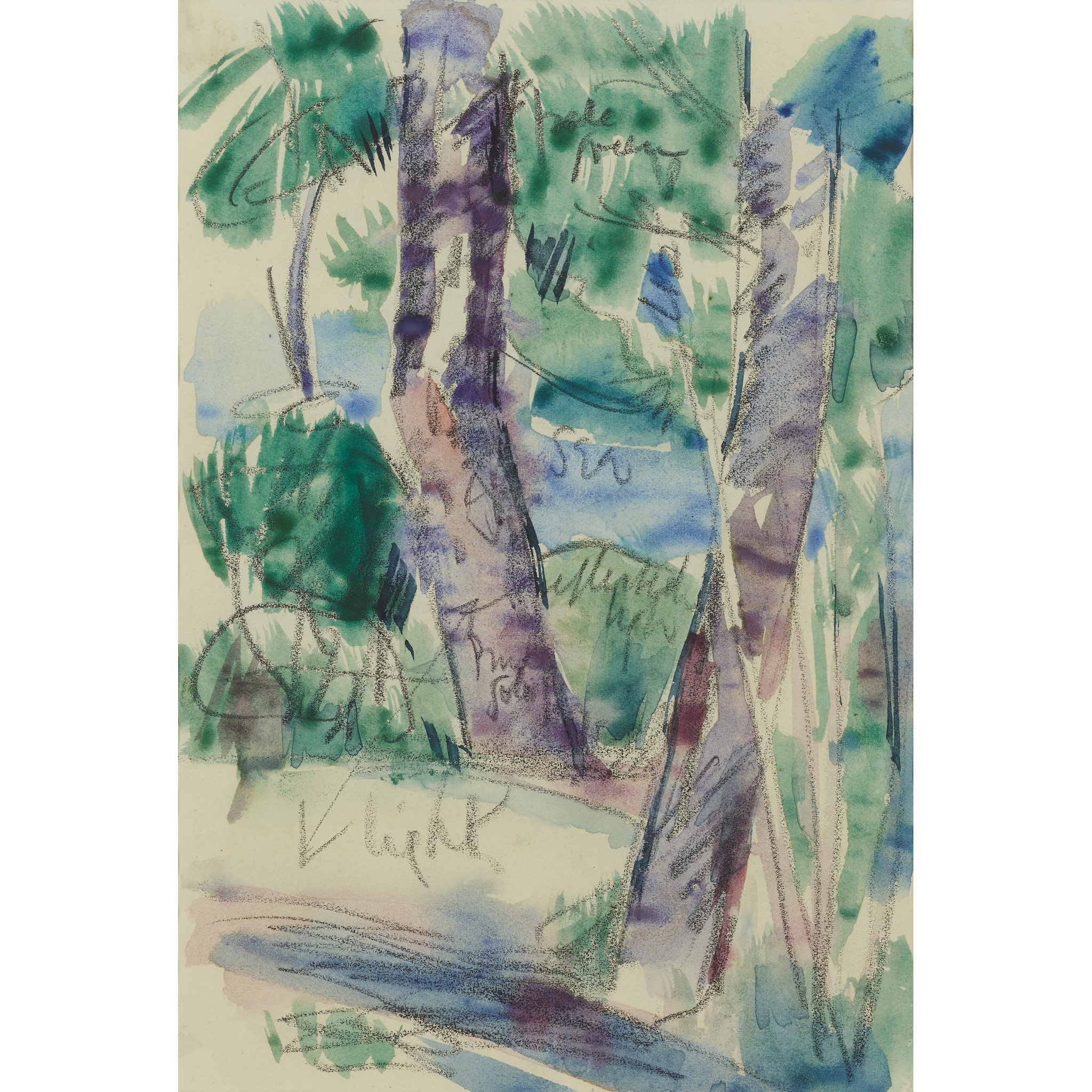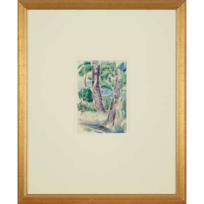 A full and frank appreciation of the female form is clear in works including Standing Nudes, Nude Seated on a Balcony and Reclining Nude, La Petite Farandole, Cap d’Antibes (Margaret Morris). A more nuanced admiration for feminine beauty can be seen in In the Garden, which, along with Palm Trees, Cap d’Antibes, bears colour notes to inform future works.