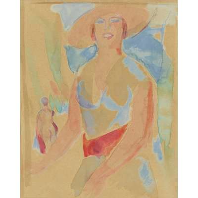 Fergusson left Paris in 1913 for the Cap d’Antibes, thus beginning a lifelong love of the area in the south of France. This affection was shared by his future wife, the dance pioneer Margaret ‘Meg’ Morris after she visited him there that Christmas. Her celebrated summer schools were held in Antibes on multiple occasions from 1923 and these happy, carefree months spent mainly outdoors were captured in watercolours such as The Red Belt, A Couple and Bathers at Eden Roc.