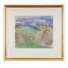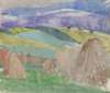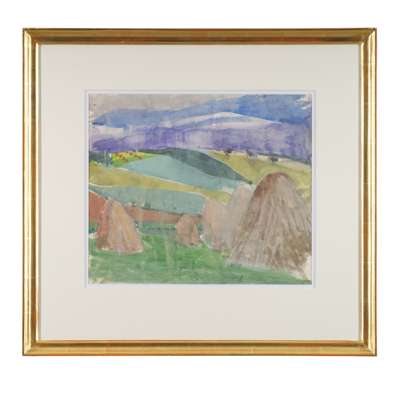 Following her marriage in 1920, Redpath lived in France for fourteen years, where her three sons were born. The watercolour Behind the Old Church, Villefranche of 1934 dates from towards the end of her time there. It reveals not only the maintenance of her practice whilst juggling domestic responsibilities, but also the clarity and deftness of line which singled her out as a draughtsperson of excellence. Haystacks underlines her skills as a watercolourist, filling swathes of the support with colour fields and manipulating varying levels of saturation in passages such as the lower sky to great effect.