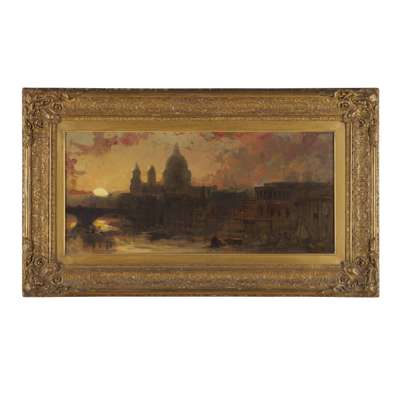 St. Paul’s, Sunset immediately recalls the works of Turner; the view of the dome silhouetted against the pink sky clearly inspiring both artists’ most Picturesque tendencies. More restrained than the dream-like hyperbole of Turner, this is nonetheless a beautiful, Romantic interpretation, astounding – as ever with Roberts - in its technical prowess. As Michael Pidgley notes in his catalogue essay which accompanied the 1986-87 Barbican retrospective of Roberts’ work, the Victorian era prized and appreciated ‘honest toil’, which his oeuvre certainly exudes in spades. Roberts’ works are breath-taking in their technical fastidiousness, but nonetheless appreciative of the character and charm of their locale, as evidenced by the two fine examples offered here, including Eglise de St Jacques, Dieppe. It has been suggested that St Paul’s, Sunset is a study for St. Paul's from the River looking West, Sunset of 1863 (untraced).