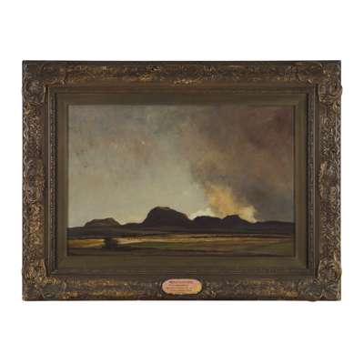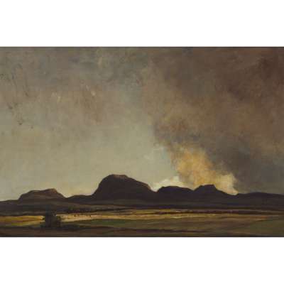 David Young Cameron was born in Glasgow in 1865 and began his training at the Glasgow School of Art in 1881. Although his first success came through etchings in the early 1890s, Cameron also worked extensively in oil and watercolour. He and his wife Jeanie Ure Maclaurin lived in the Scottish Highlands, where he drew much of his inspiration from the surrounding landscape. Unlike the Glasgow Boys, Cameron was less interested in the decorative aspect of painting, focusing instead on the changing quality of light and the atmospheric character of the Highland environment. His belief that colour, tone and light were more important than the ‘story’ a painting conveyed often placed his work outside the mainstream of the Glasgow School.