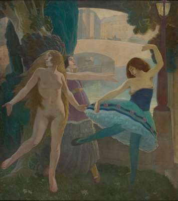 Le Ronde Eternel is one of two completed related paintings, along with Love’s Invading (Culture Edinburgh, acc.no.CAC1982/3), from a planned series of five, derived from Robertson’s 1915 drawing, The Daughters of Beauty. John Kemplay describes the drawing as portraying a ‘host of young women, some of his acquaintance and some of his imagination, set against a backdrop of architectural features of Edinburgh and Dumfries, the town in which he was born.’ During the First World War, Robertson served in France with the Friends’ ambulance service, but returned to the subject afterwards to complete the larger scale paintings.