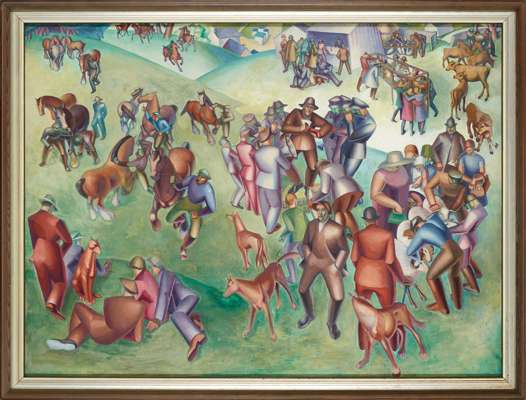 “…mechanical vision inspired by pre-First World War Italian Futurism and its London off-shoot Vorticism. Miller Parker’s crowd scene shows humans as tubular shaped with hands like implements…indebted to the crowd scenes of William Roberts who had been a signatory of the Vorticist Manifesto…scrutiny reveals her picture to be about more than trading horses. The diagonal composition descends from the distant bare-backed riders (top left) to two foreground men and their dogs (bottom right). The fair extends over three hills above a village (centre top). To the right of the glimpsed village are a beer tent, duck and chicken pens and ambling calves. Below them is a…cluster of people around some ewes and rams, among them a formidable woman in a summer hat. The most energetic group is the cart horses led by tugging handlers. That they contradict the scale of the adjacent groups emphasises their dynamism, as does the robotic exaggeration of their actions.” (‘John McEwen comments on The Horse Fair’, Country Life, 15 June 2020, p.56)
