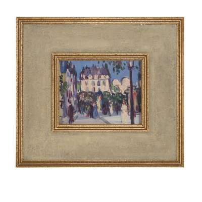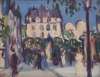 Deft brushstrokes outline people, trees, buildings and street furniture, such as the anchoring lamp post on the right of the composition. Highlights of colour including the blue of the full-length dress of the woman at the centre of the image, provide rhythm across the work’s surface. The leaves which enter from the upper right partner with the depth of view realised behind them to create a sophisticated perspective in which buildings are seen from the side as well as straight on, whilst the scene is illuminated throughout by the idyllic blue sky. Passages such as the short strokes of green at the far left and the suggestion of foliage across a mid-vertical, verge on the abstract, revealing Fergusson’s newfound confidence and innovative approach to his work. This was to result in his election as a Sociétaire of the progressive Salon d’Automne in 1909, in recognition of his contribution to the modern movement.
