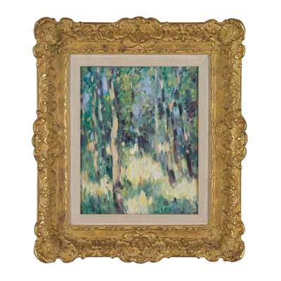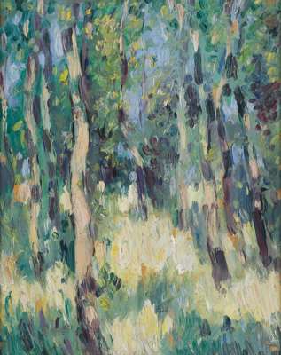 Sunlight in the Woods, Peebles, Midday, Peebles and The Haystacks date from the beginning of Fergusson’s career. Having spurned the traditional training available at the Trustees’ School of Art in Edinburgh, he determined to educate himself, including during spells at the Académies Julian and Colarossi in Paris. These three small-scale works are typical of those he painted in the French en plein air manner, responding directly to the rural scenes before him.