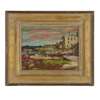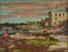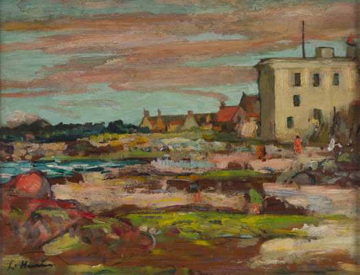 The Scottish Colourist George Leslie Hunter enjoyed a studio practice combined with working en plein air, as revealed in the works presented here. In the early 1920s he discovered the aesthetic delights of the parish of Largo in the Kingdom of Fife, on Scotland’s south-east coast, containing the villages of Lower and Upper Largo. As can be seen in Lower Largo, the beach provided an array of subject matter for his brush. Much is made of the textured foreground of rocks, seaweed and sand. This gives way to the landmark Crusoe Hotel, so named because Alexander Selkirk, on whom the character Robinson Crusoe was based, was born nearby. In the distance a skyline of village buildings curves around the bay, under a sky containing clouds possibly lit by an unseen sunset. Rowing Boats, Largo shows the view from the nearby pier onto the harbour which was an especially favoured motif of the artist.